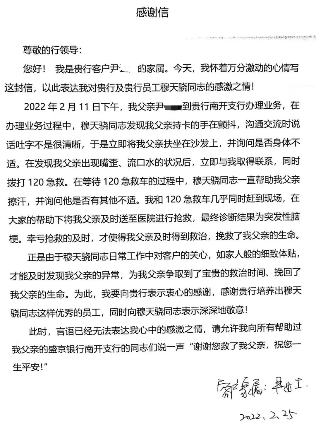 “感谢贵行培养出穆天骁同志这样优秀的员工。正是日常工作中对客户如家人般的细致体贴,才能及时发现我父亲的异常,挽回了我父亲的生命。”