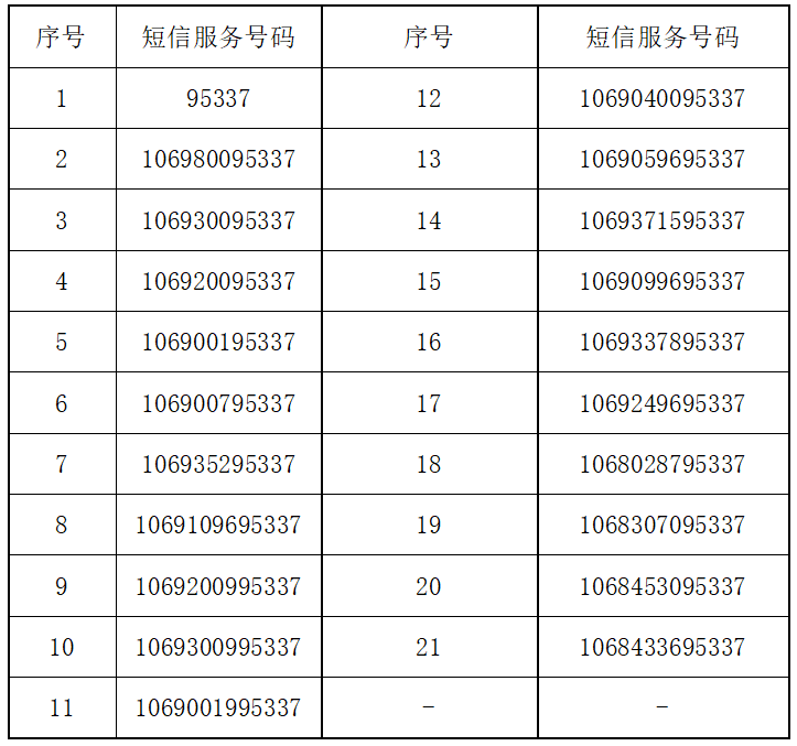 为持续向您提供更加优质、全面的金融服务,盛京银行计划将我行短信服务号码增加至21个,具体如下。